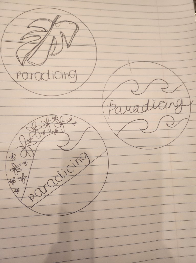 This design process included research from our required readings, multiple tries at our Illustrator tutorials in class, sketching, and a lot of patience. After completing the required readings and our illustrator tutorials, I proceeded to reflect on ideas about how I wanted the logo to represent myself and my website, paradicing.com. I wanted my logo to be colorful, tropical, and fun. So, I then took to my notepad, and after a few sketches, it was clear to me that I wanted a circular logo that was inclusive of tropical visions and colors.