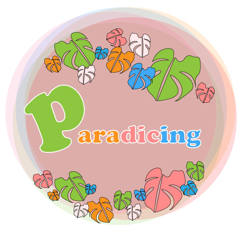 I placed the monstera leaves as a lei around the circle and added my website title “paradicing.” I used a stroke of 3 px for the font and changed the individual color to blend with the arrangement of colors in the entire logo.