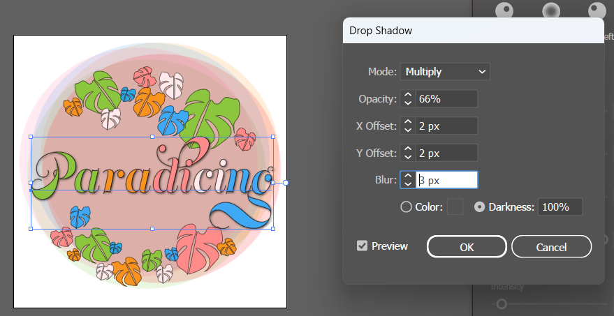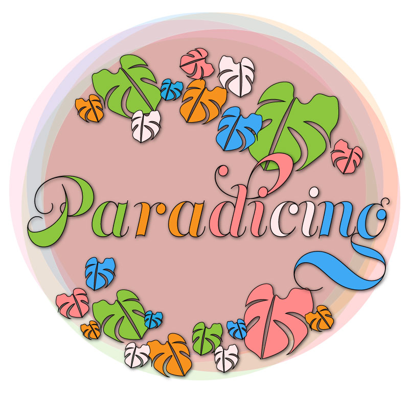 I placed the monstera leaves as a lei around the circle and added my website title “paradicing.” I used a stroke of 3 px for the font and changed the individual color to blend with the arrangement of colors in the entire logo.